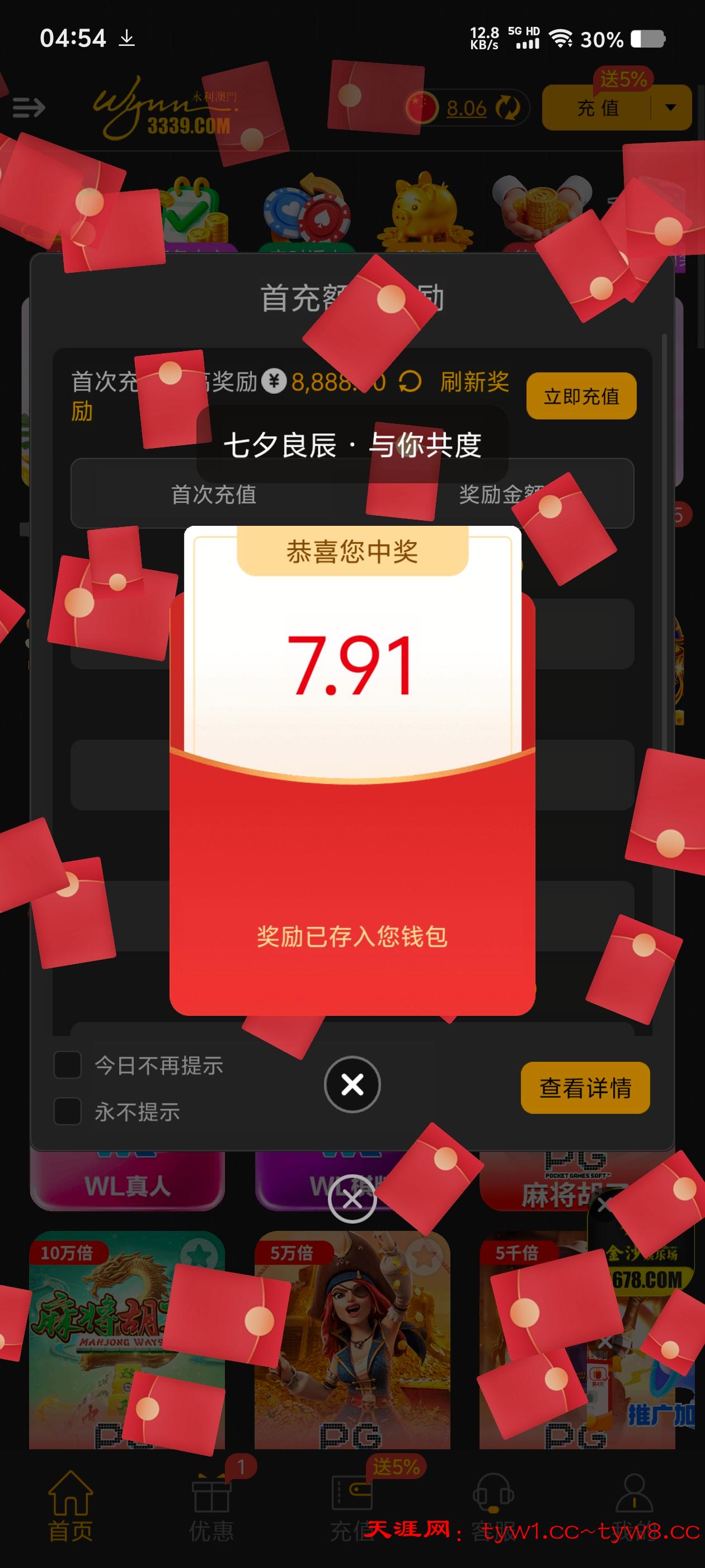 七夕鹊桥红包雨,8月29日,浪漫专属红包雨。历史注册且充值过的会员,七夕当天登录APP无条件抢夺专属红包一份,最高8888元!