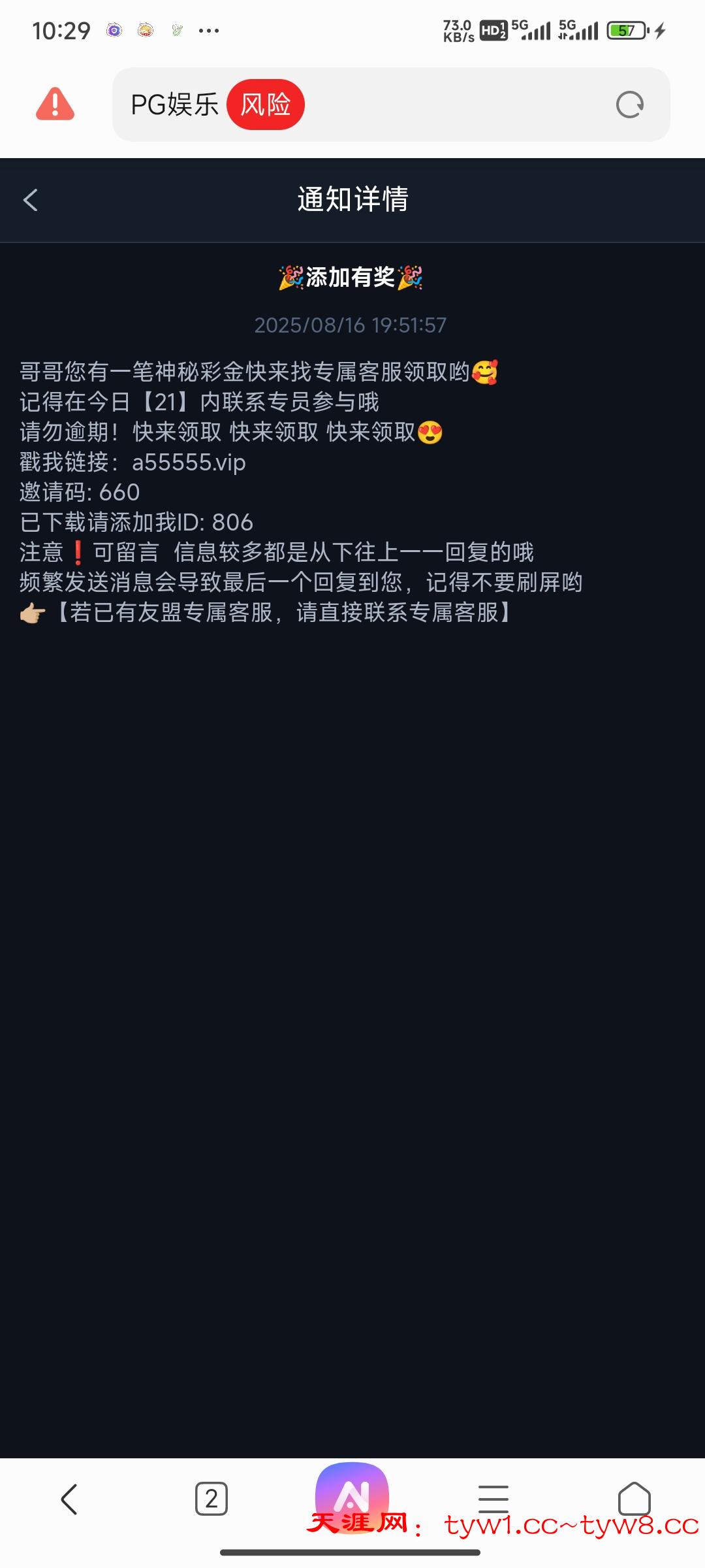 兄弟们,去看一下有没有这个站内信 是没有的话也可以拿这个图片或者自己发ID碰瓷儿 我这个图片是之前的了我一直没看过站内信 然后今天就看了一眼没有,然后我就去碰瓷碰到了,另外还有这个七夕神秘彩金
