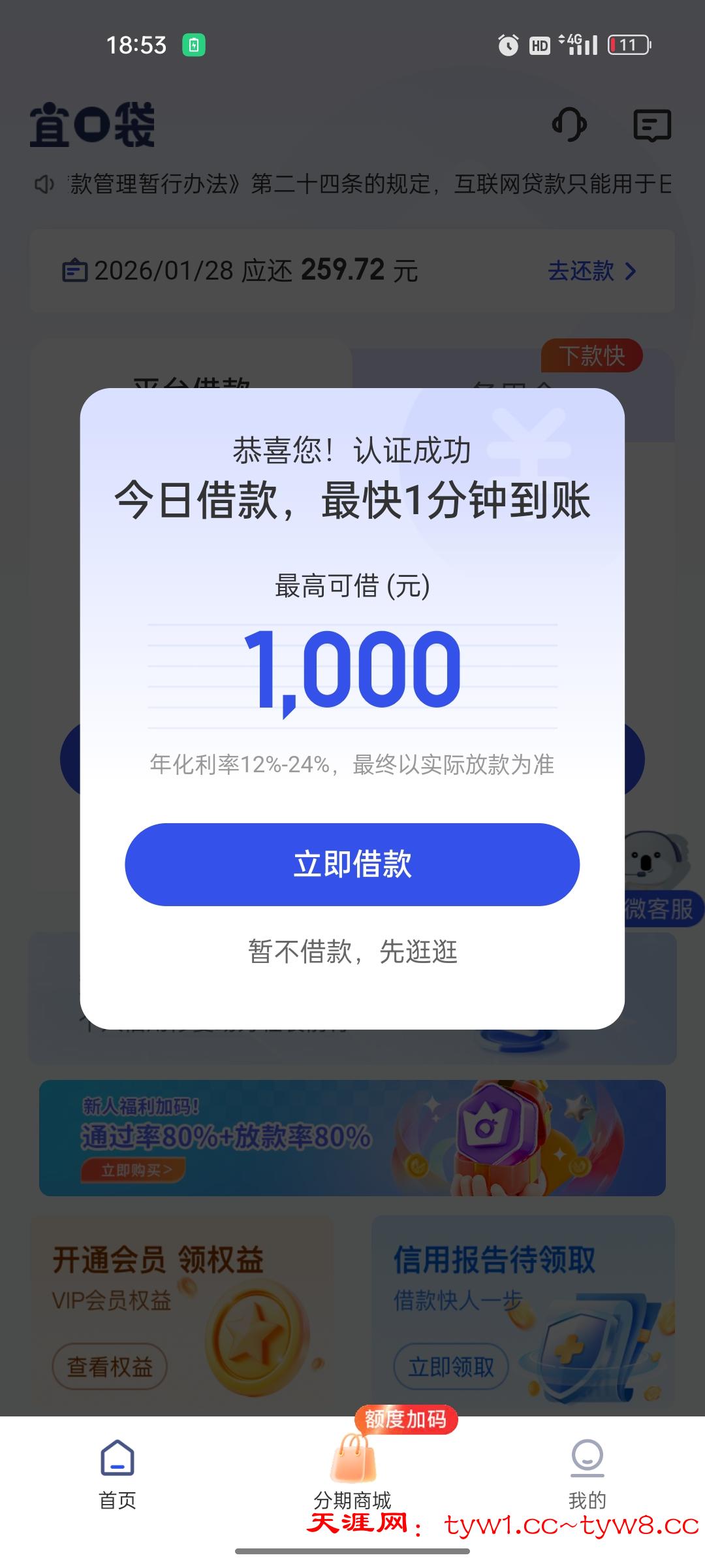 下款额度下不了的。购物额度还可以。这个你如果这个系列的有逾期没还。1000额度就会多,而且能下。没有逾期下不了