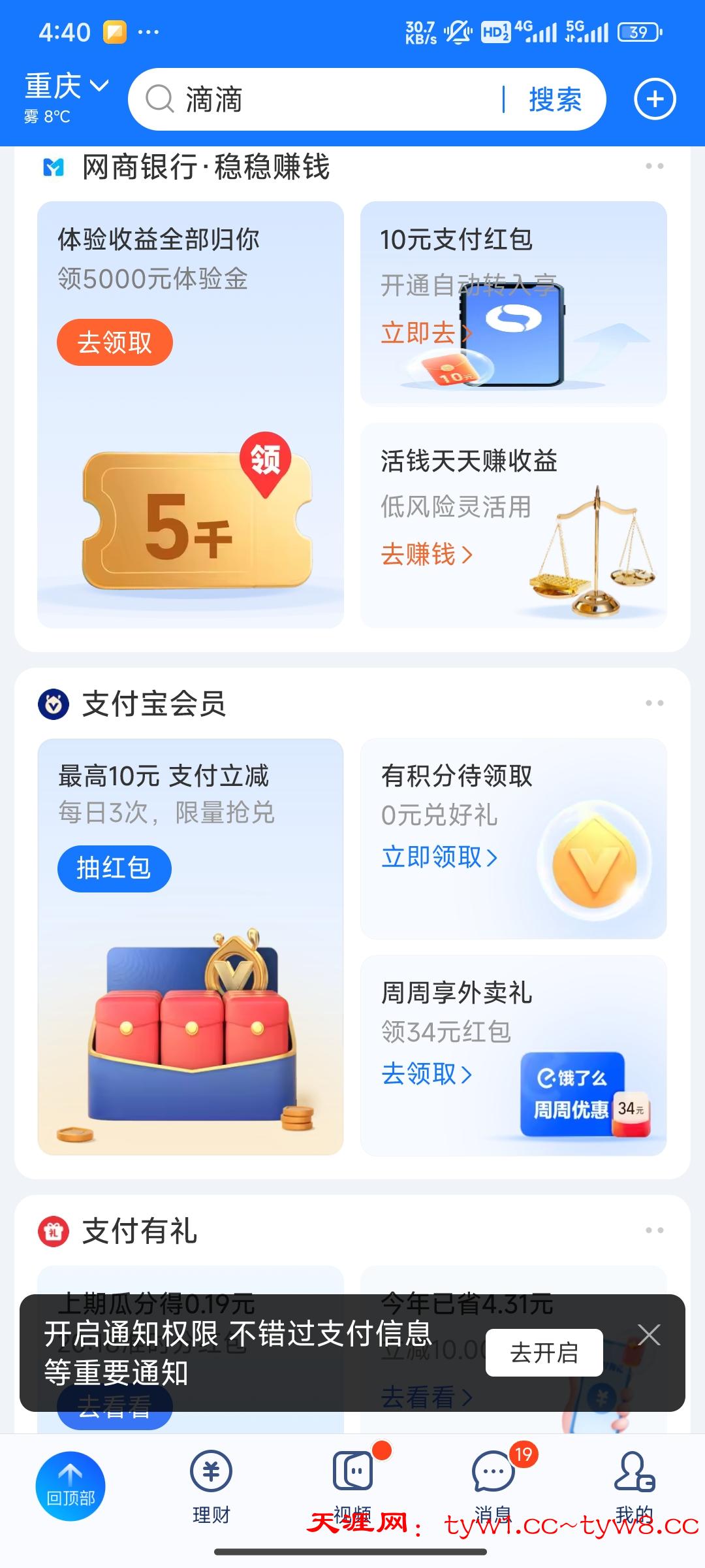 支付宝首页往下滑 找到网商银行这一栏,如图右上角有个十元支付红包可以领