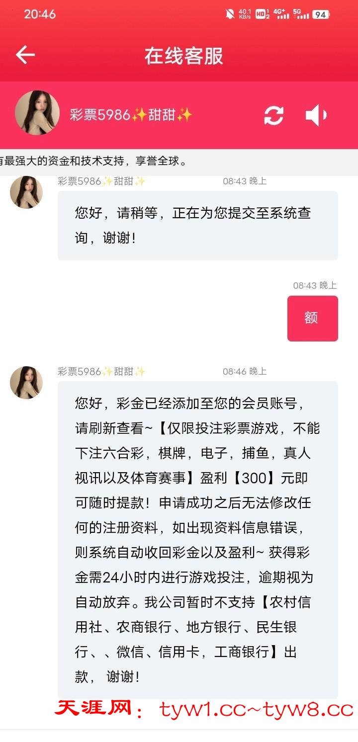 地址5986.cc 下载注册绑卡找客服申请下载彩金 发账号和登录点我的截图 客服回复很慢 我领到了没打出来 不会玩 只能彩票