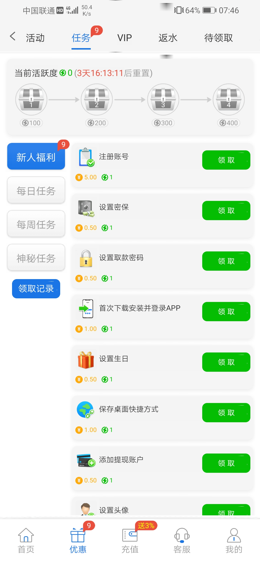 优惠→任务 自助领取10