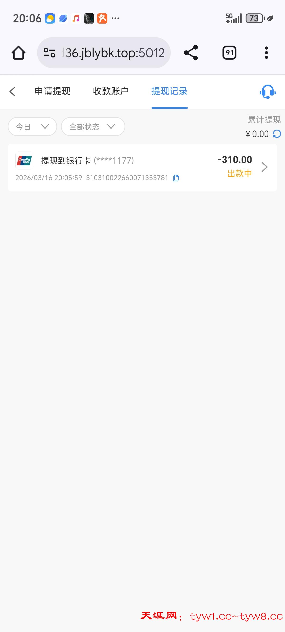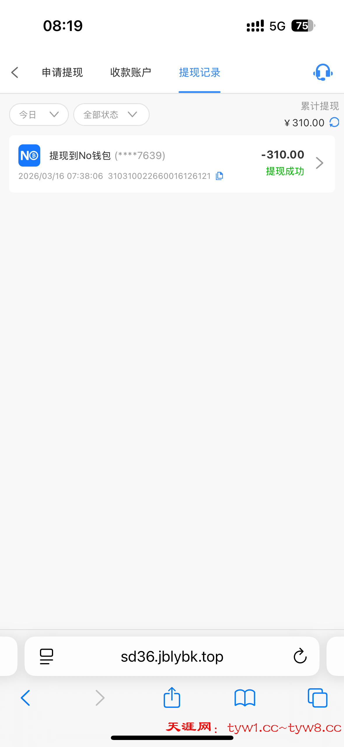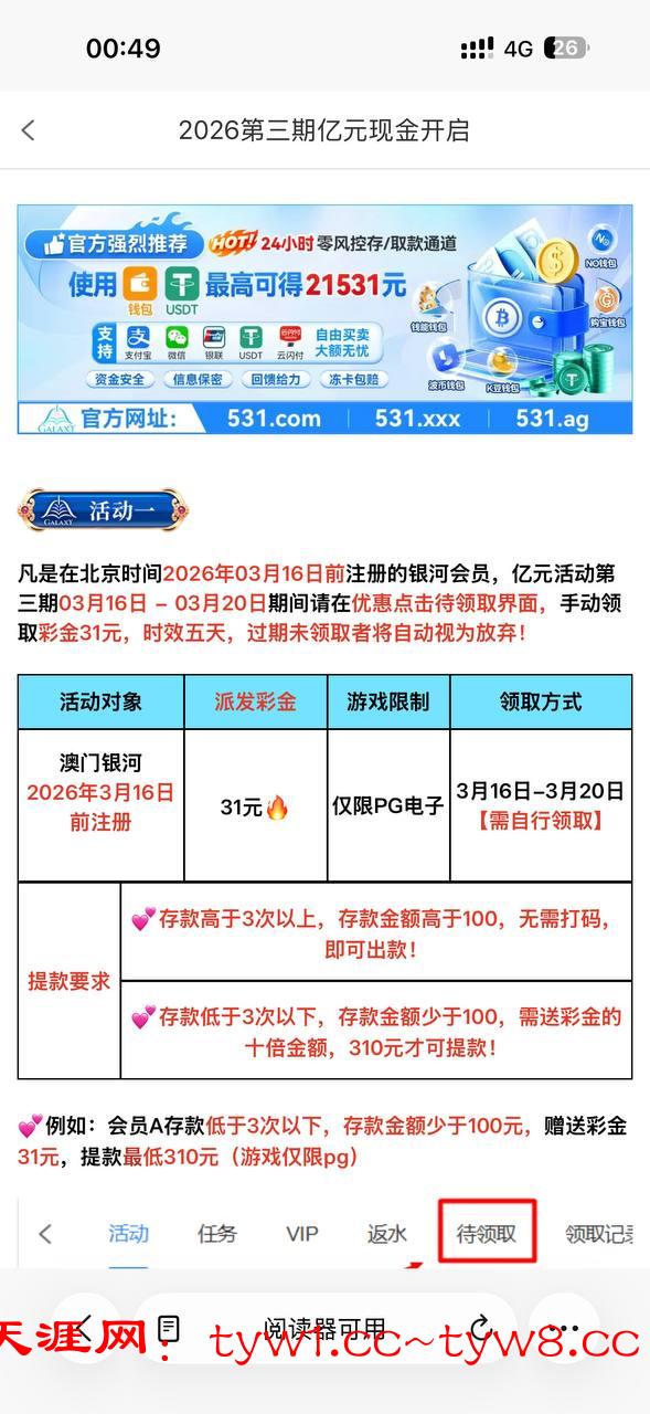感觉要黑了,要充值才能领取,我充值了领了31打到了310,提现到钱能钱包,提现20分了还没到账