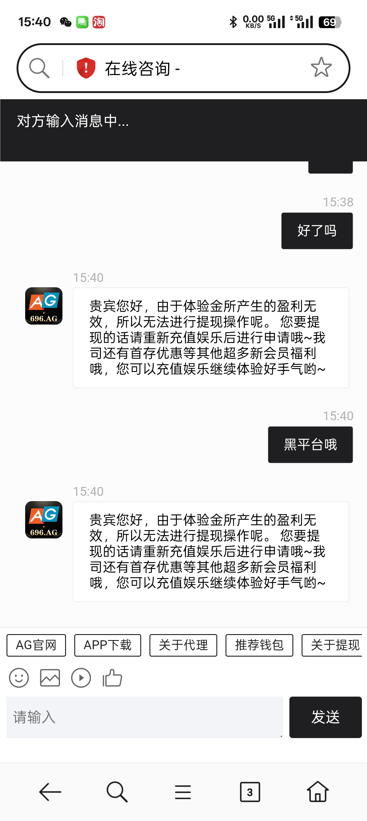 ag696就是黑台 充钱玩也被黑 ag是你爹吗看不得别人白嫖 就是个黑台子 赢钱了各种理由黑你的 老子就被黑4000