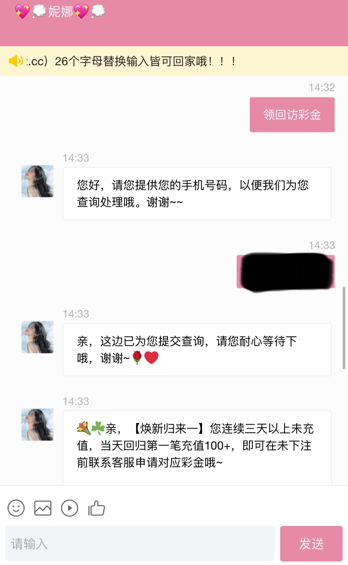 碰瓷电话回访彩金 联系在线客服领发手机号给客服查 没注册过的也可尝试先注册不要绑卡等电话回访 切勿充值 白嫖即可