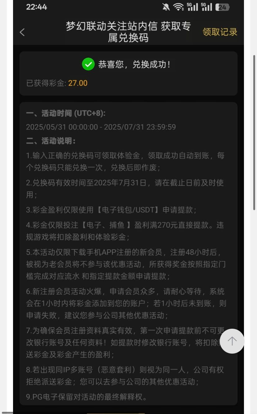 登录上去看到有个站内信用彩金码兑换了了27 打出来350 提u已经到账了 网址 2016.com