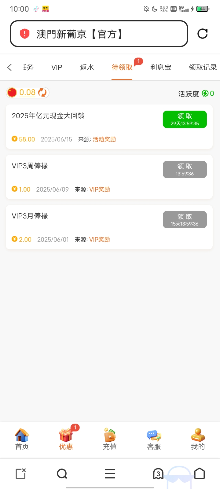 每月15日会员日,一个月内有投注的别忘了上线领取,领了58,得吃1000。可惜4块钱赏金进的赏金没炸,要是炸了今天就回血了
