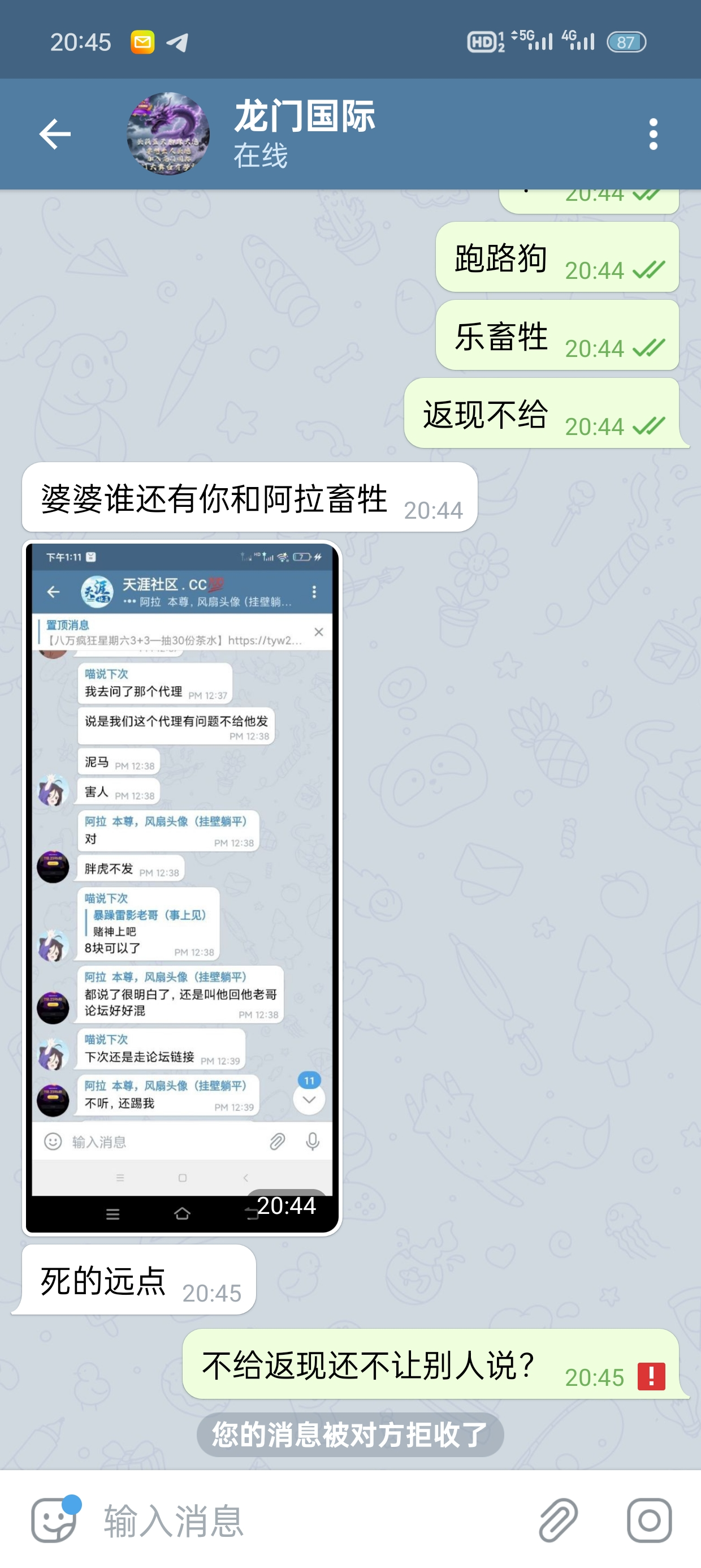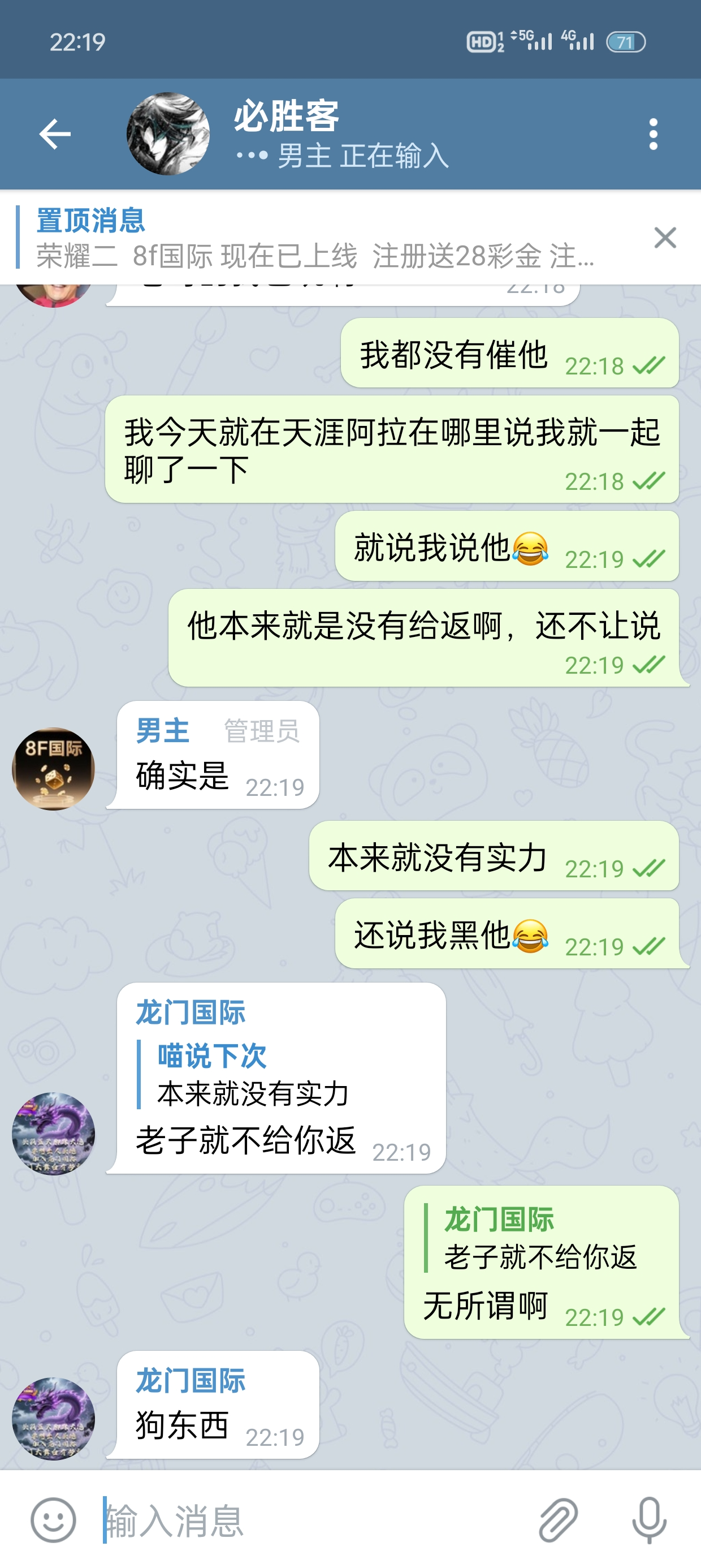 pop群龙门国际群不要玩他推的台子,答应返现不给,还直接退出去,你去问他自己退出去,说你天天要,不答应的返现不给还有理了,兄弟们认证天涯论坛稳台,不要去玩这个代理没实力,24个人头费一个都没有给,直接黑掉