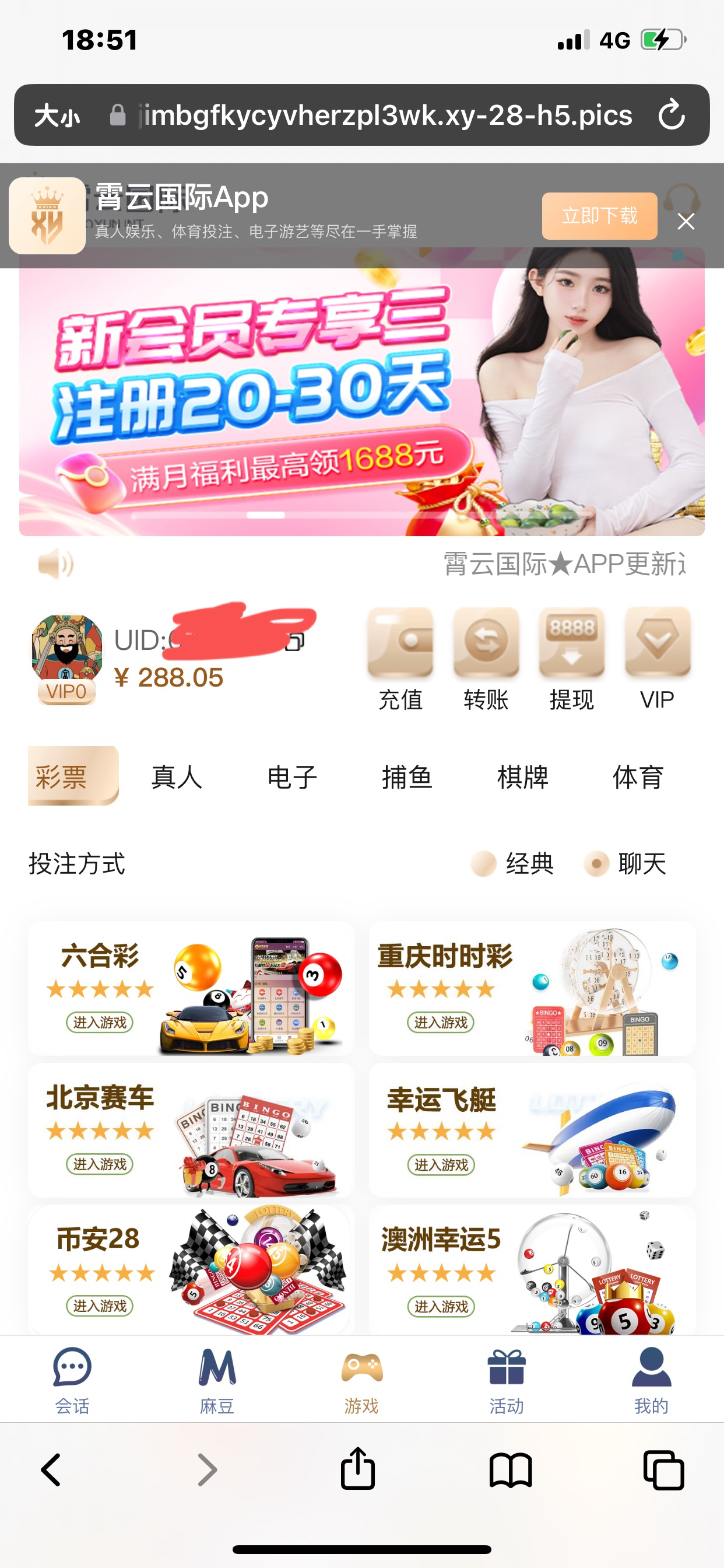 两天论坛不发了霄云回归彩金嘛 然后我去碰一下没有彩金 叫我充值100送188 15水 然后我今天上了真送188 但是打不出不给提款啊 帐号都给我删除了 旺旺大冰那个也把我删了没有截图到霄云国际是黑台大家避坑