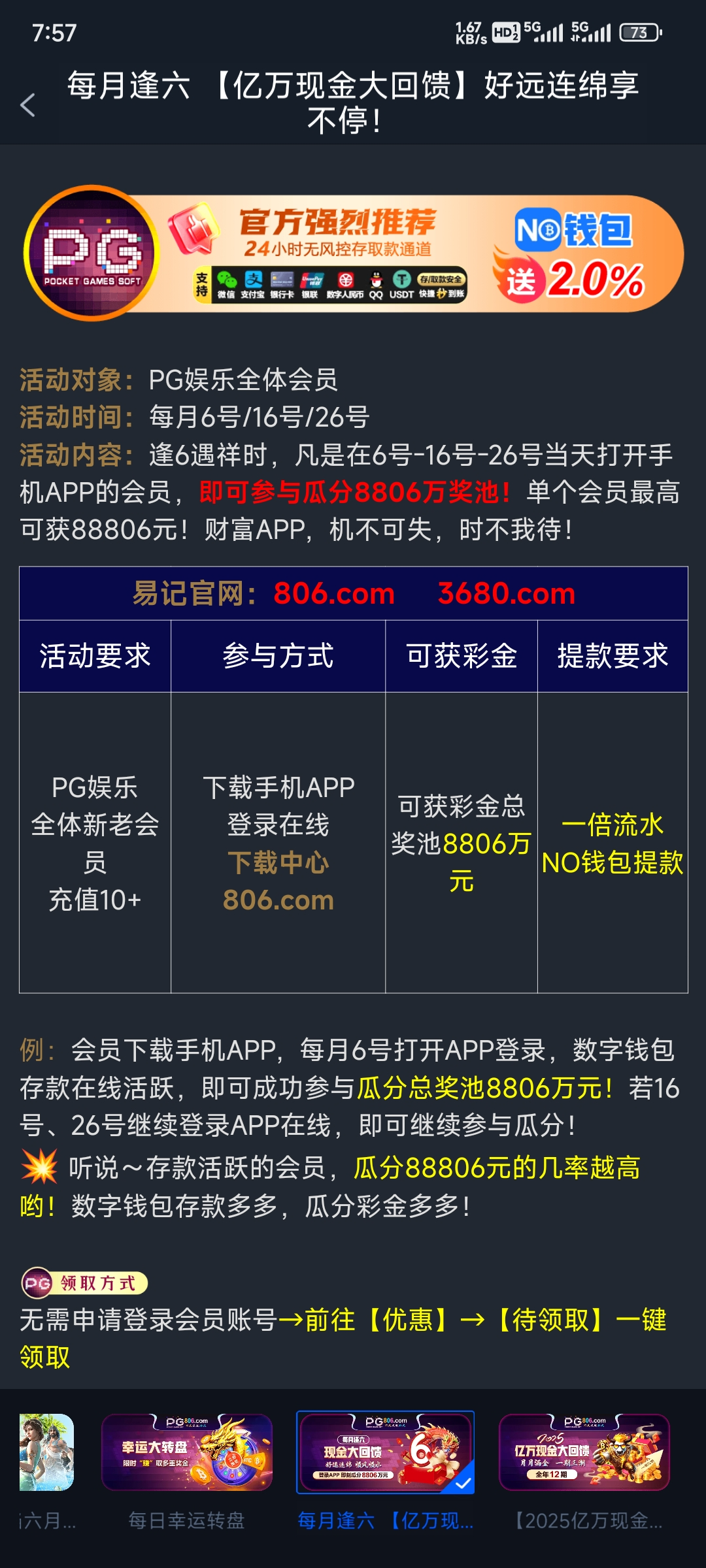 我操,我没想到我也能遇到这种,这个台我最多遇到神秘彩金108,没想到遇到逢六必发,网址806.com,有号的兄弟现在就可以去看看 没有的话就等晚上12点去看看,有些是还没有派发的
