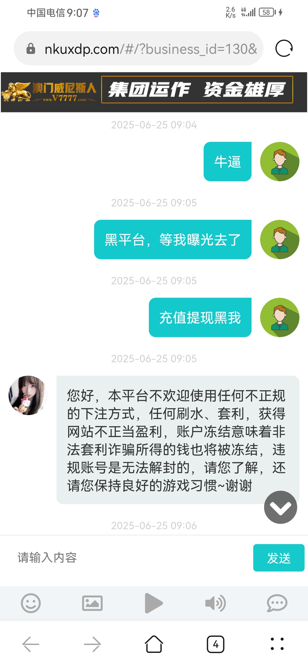事情是这样p了三百上去了,玩龙虎我也不知道下什么都是中,很轻松就打上980。保证没有对打。可惜高兴之余就高兴不出来了,狗庄说我不可能把把中说我开挂真的可笑。唉对不起兄弟们本来想团的看来团不成了,这个死客服老子喷死他天天p他。p图没查出来说我下注违规真的牛逼 。